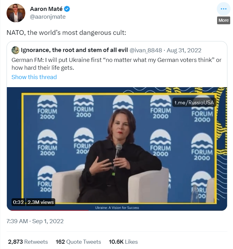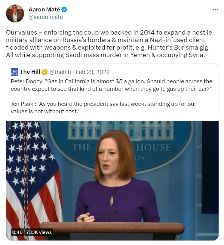 Aaron is heavily in the “US/NATO provoked Russia to attack Ukraine” corner, which can also be seen from his tweet right after the invasion began. Naturally, his very much against NATO and its expansion and has called it “a cult”.