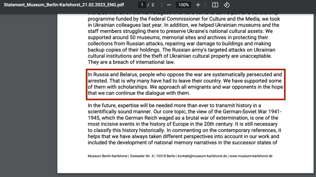However, it is worth mentioning that the team of the Museum Berlin-Karlshorst released the statement on February 21, 2023, dedicated to the anniversary of the Russian full-scale war against Ukraine, in which they condemn this war in the “strongest possible terms”.