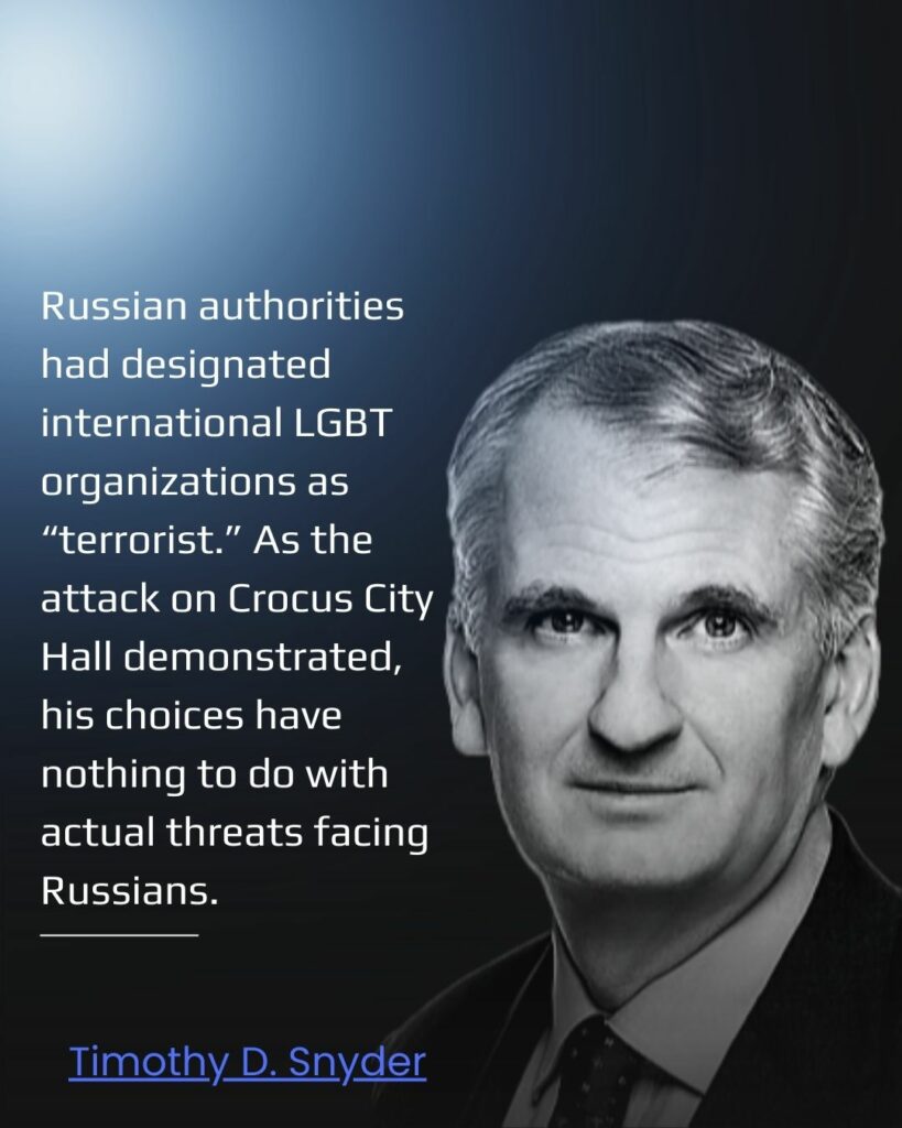 Earlier that day, Russian authorities had designated international LGBT organizations as “terrorist.” Also earlier that day, Russia had carried out massive terror attacks on Ukrainian cities. Those actions reveal the enemies Putin has chosen. As the attack on Crocus City Hall demonstrated, his choices have nothing to do with actual threats facing Russians.