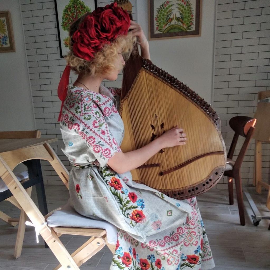 A blonde girl wearing a red poppies wreath, Ukrainian costume, necklace, and holding the bandura in her hands — that is how 17-year-old Maria Vdovychenko looked at pre-war photos.