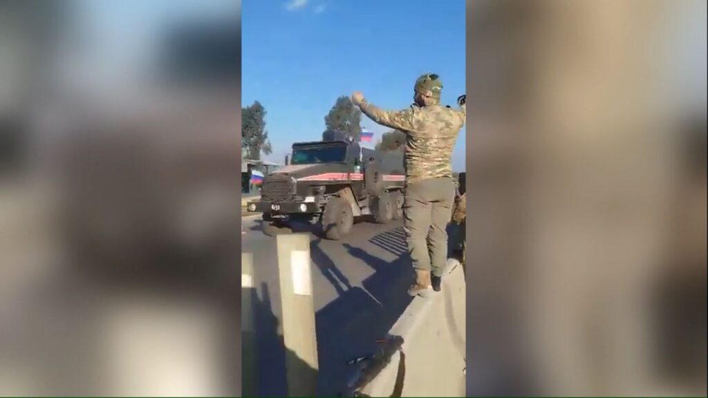 The video also shows a man in a military uniform waving his shoe at passing Russian military vehicles. In Arab culture, greeting or saying goodbye to someone with a shoe is considered the ultimate insult.