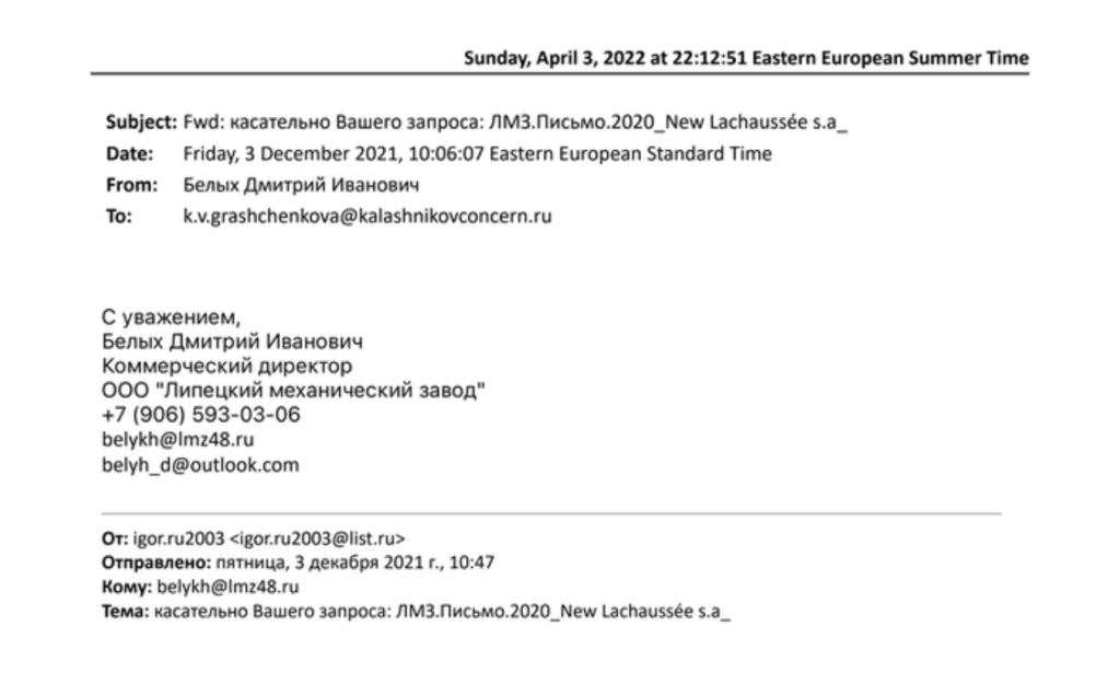 Further correspondence with manufacturers is conducted on the chain “Kalashnikov – Lipetsky mechanical factory – an international manufacturer.” However, on December 3, 2021, a representative of the Belgian New Lachaussee s.a. Igor Zagivil responded. His contacts were forwarded to the Kalashnikov Concern by the commercial director of LMZ.