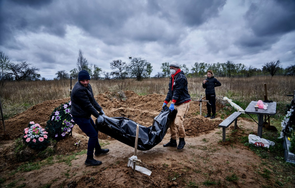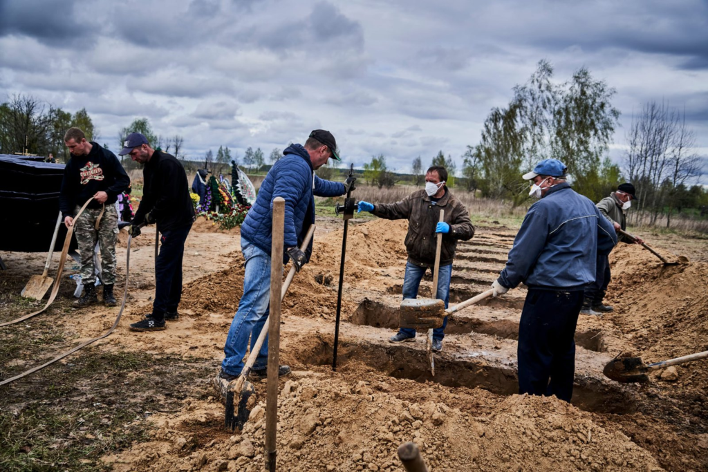 Several men, about 30 of them, leaned over one of the graves in the cemetery. They were gloomy, silent, and laconic. They change each other: someone digs, someone goes on a smoke break. The grave was made hastily – during the occupation, several locals brought here five dead people and buried them under fire. Men dig about a meter and a half until from under the sandy soil one can see the bodies stacked next to each other, like fish in a can. After more than a month of lying down, you can’t see the face – now there is a swamp-purple mash in their place. Only clothes, shoes, tattoos, and someone’s ring on his finger – all these investigators write in the reports as “special features”, by which then someone will be able to recognize a loved one.
