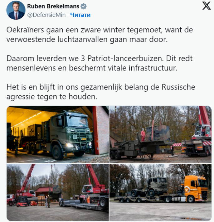 On 28 November, Minister of Defence of the Netherlands Ruben Brekelmans announced the transfer of three Patriot air defence systems to Ukraine.
