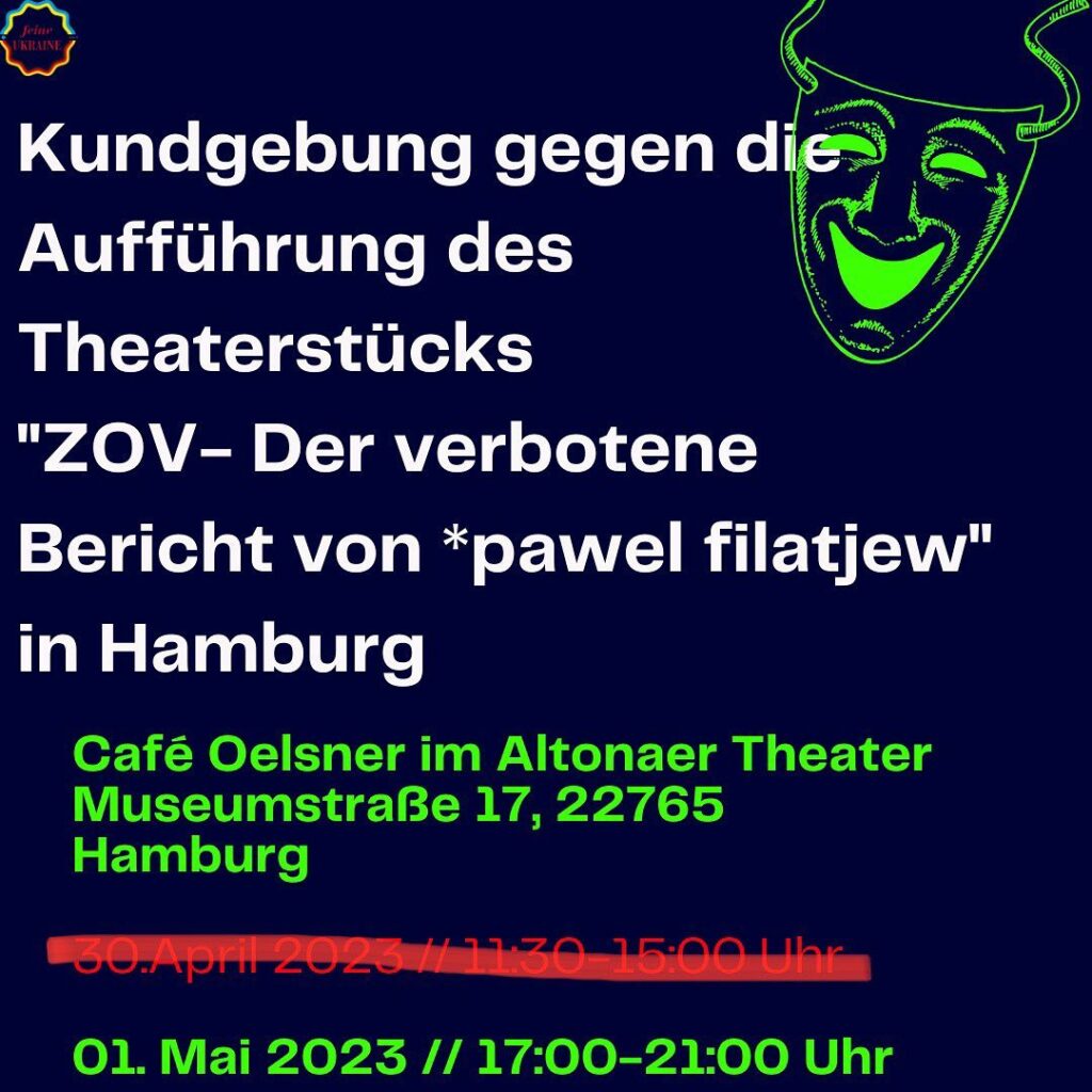 Feine Ukraine -Verein der deutsch-ukrainischen Zusammenarbeit activists will hold a rally against the play “ZOV – the forbidden story” on 1 May.
