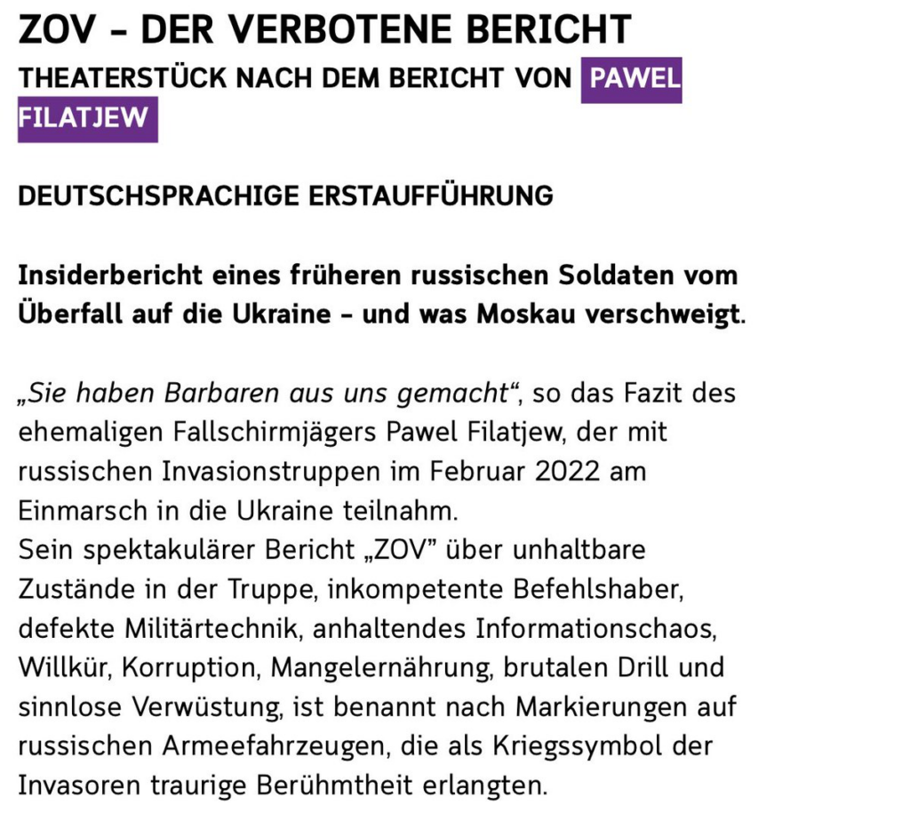 The Altonaer Theater in Hamburg is scheduled to stage a play based on the book by Pavel Filatyev, a former Russian soldier who participated in Russia’s full-scale war of Ukraine, called “ZOV – The forbidden story”. A Russian soldier’s complaint about the poor state of the Russian military during the invasion of Ukraine.