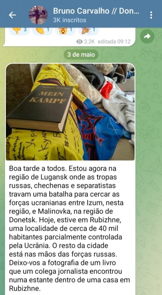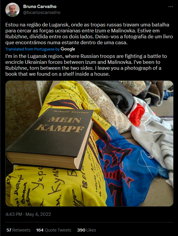 Perhaps due to his political background, Carvalho is all about them Ukrainian nazis. He calls the Azov Regiment “the neo-Nazi Azov Battalion”, being consistent with the views of his party, PCP.