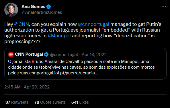 Former MEP Ana Gomes asked the CNN about the issue, but neither @CNN or @cnnportugal responded to her. Carvalho’s shared a video of Zelenskyy with subtitles that turned out the be fake. He added a “correction” that suggested that the “opinions are divided” on what Zelenskyy actually said, which of course isn’t true. As of today, Bruno’s tweet is still available.