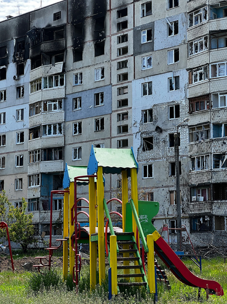 Next to the ruined gym, a playground is sinking in the grass, where no one has been playing for more than three months. A trench stretches through from it like a snake. In the background – a typical for this area high-rise from prefabricated panels. A large black spot on it is the result of the fires.