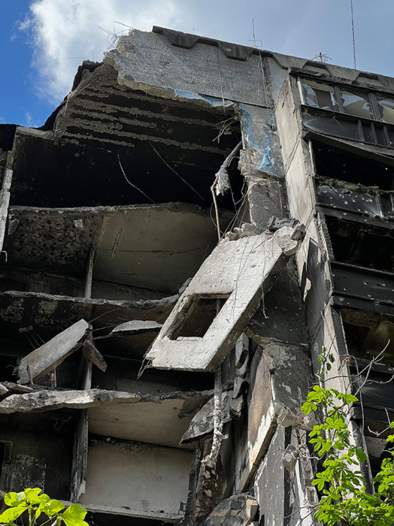 We walk another hundred meters and see real ruins – a house without a roof and with a broken front wall, blackened and perforated, with pieces of concrete and reinforcement hanging lifelessly in the air, completely empty inside. Piles of debris and broken trees are next to it.