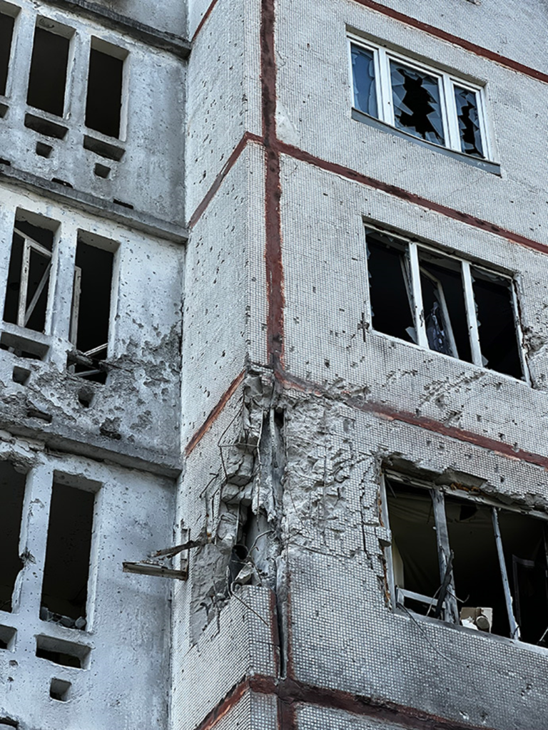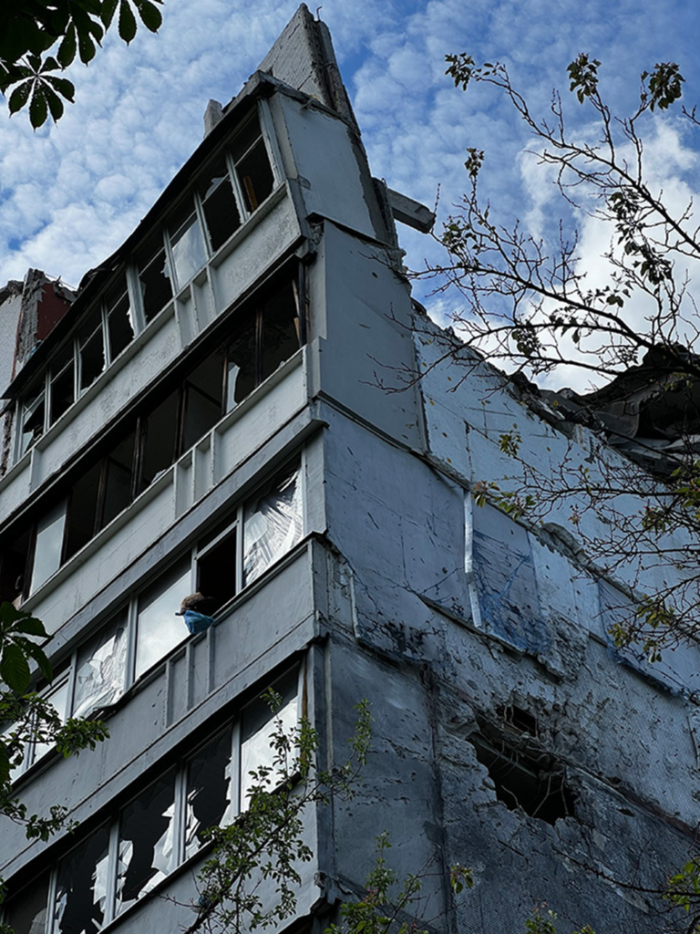 The man’s name is Oleksandr. He says that he works in security at a “serious firm”. He has lived in Saltivka for 15 years. “I communicate with my house. It used to be my home. But only ruins remain. The Russian World has come, the ‘liberator.’ They freed me from my home,” he smiles bitterly. “The very first hit was on February 25, I was at home. I moved to people who are like relatives. It’s in the city, it’s more or less quiet there, but I still feel awkward. We will, of course, ask for housing compensation. It is necessary to complete the online registration in the Diya app. But where can I go? An audit will be carried out to check the damage. Perhaps they will need to demolish the building.”