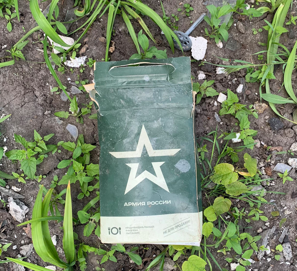 Pieces of concrete, broken window frames, broken windows, broken boards torn from the wall heating battery, blackened kitchen utensils, clothes torn to pieces, and overturned garbage cans are lying underfoot. We find a ready-meal package of the “world’s second army” near one of the buildings.