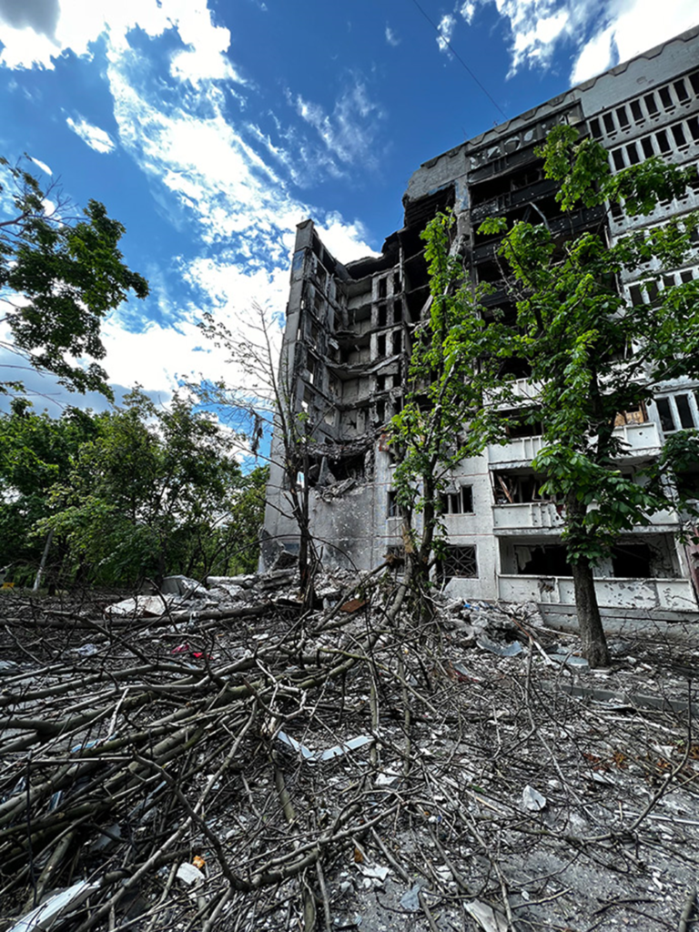 According to the Ministry of Defense, 70% of residential buildings and infrastructure in Saltivka have been destroyed. Denis does not see a future for the district and suggests just to leave everything here as is.