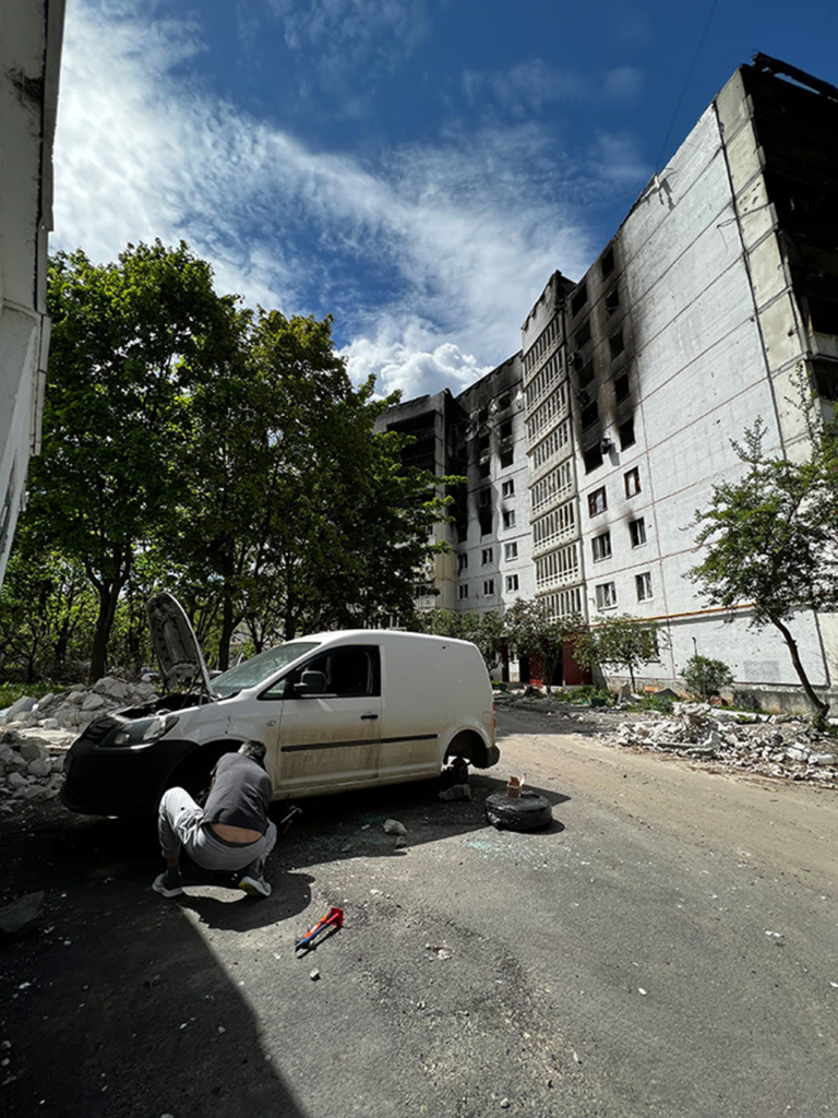 Nearby, a man in a Coca-Cola T-shirt and in white gloves is squatting with tools near a white Volkswagen van. Here, on Metrobudivnykiv Street, Denis has lived since the neighborhood was built in 1990. He left on March 2.
