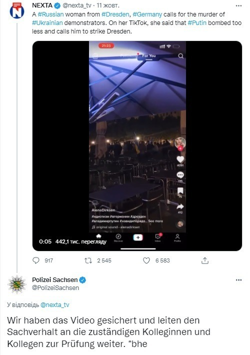 Even worse. There are several examples, that Russians trying to intimidate Ukrainian refugees in Europe. For example, on October 10, just after the barbaric missile strikes on Ukraine, killed 11 and wounded at least 87 civilians, Russian women filmed a video in which she asked Putin to hit Dresden in Germany (where at that time was a Ukrainian rally). “There was not enough today”, she claimed in her TikTok. Later she has deleted the video, but it becomes viral. Some of the media outlets shared it.