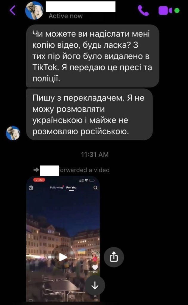 “Could you please, gsent me a copy of video, because it was deleted from TikTok. I want to send it to police and journalists. I write you via translator, because I cant speak Russian or Ukrainian.”
