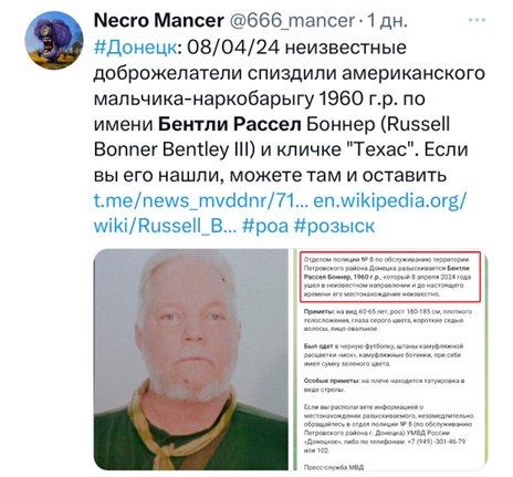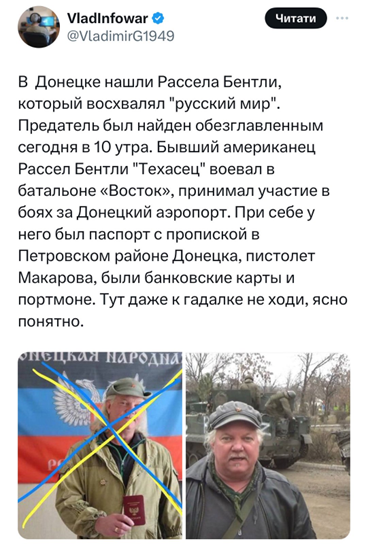 On March 14 2024,OSINT-volunteer VladInfowar stated in his Twitter that Russell Bentley was found beheaded in Donetsk.