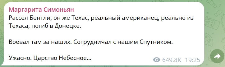 On April 19 2024, Margarita Simonyan, editor-in-chief of the Russian state television channel RT stated that Russell Bentley is dead.