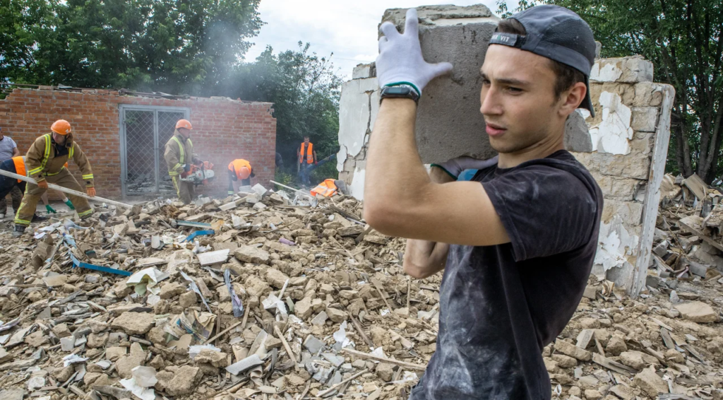 A volunteer from Sumy (in the foreground) helps rescuers to dismantle debris in Boromlya / Photo: Alexander Medvedev / NV