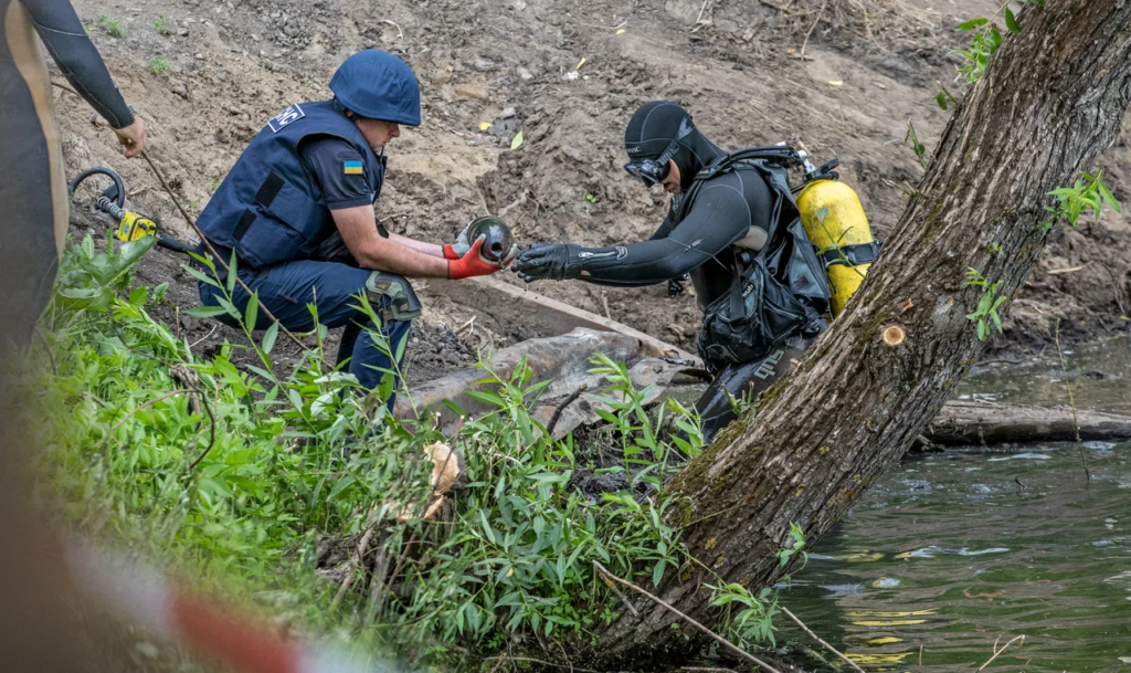 Mykola Kharchenko, a 26-year-old diver, dives into a pond with a metal detector and later retrieves as many as three 125-millimeter shells from a tank cannon. He in turn transfers them to a pyrotechnic, who puts a dangerous cargo in a car that will take the shells to the blasting site. “The bottom is very muddy, dirt to the knee, nothing is visible,” explains Kharchenko, adding that a metal detector helped him.